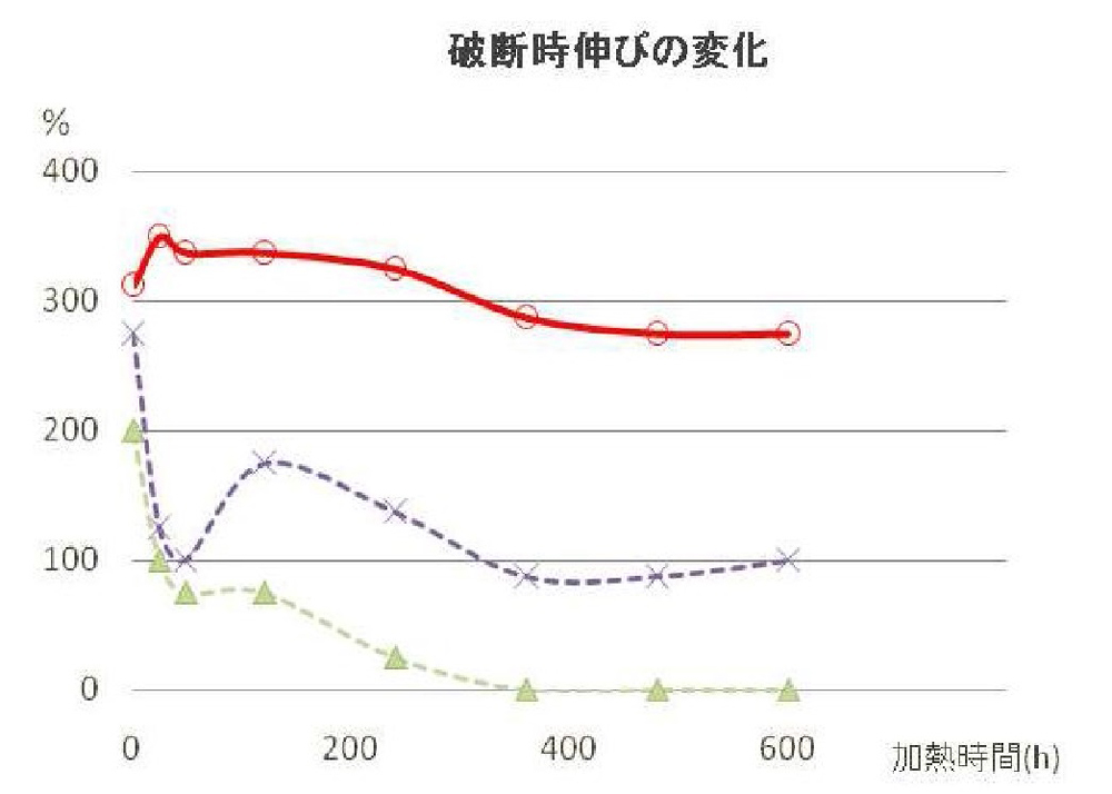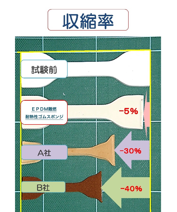 シリコンゴムを除く合成ゴムスポンジの中で、最も高い耐熱性を誇る素材となっています。一般的なシリコーンゴムスポンジの耐熱温度は約200度ですが、それを除く合成ゴムの耐熱性は100度超程度であり、蒸気を使用する環境、100度以上で発熱するする環境下において今までは高価なシリコーンゴム(スポンジ)を選択するしか余地がありませんでした。この製品は、150度*600時間の加熱試験において、引っ張り試験、伸び、硬度など様々な試験において規格値以内で性能を保持することができた合成ゴムスポンジとなっております。(試験方法 JIS K 6257)