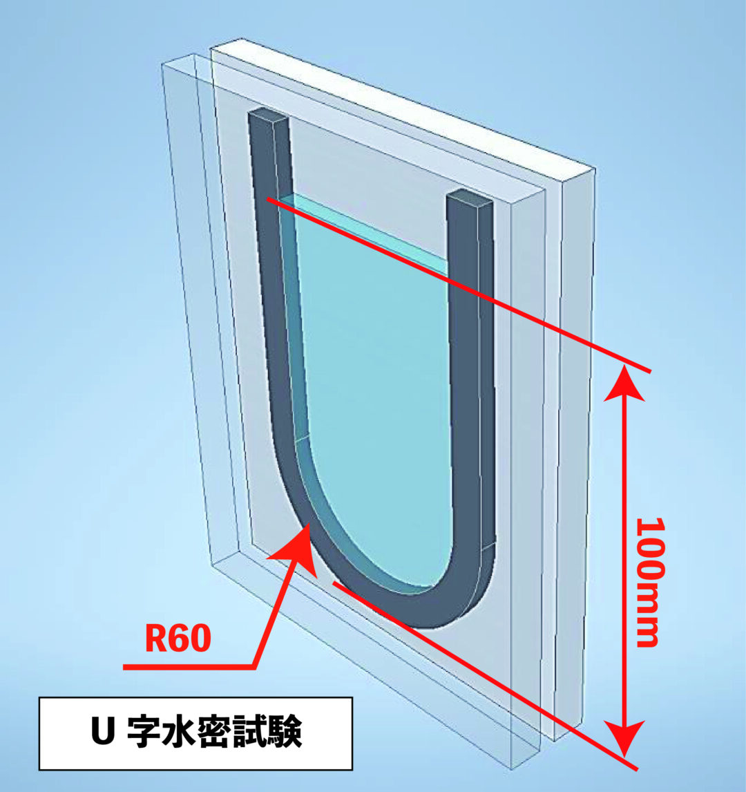 複雑な面形状を持つ被着体に対して、場所ごとにフォームの圧縮率が変化するために、低圧縮から高い止水性を発揮するガスケット材(止水材)が求められます。この試験では、実際の組付けを想定した曲げを再現し、そこでの止水性を評価しました。
