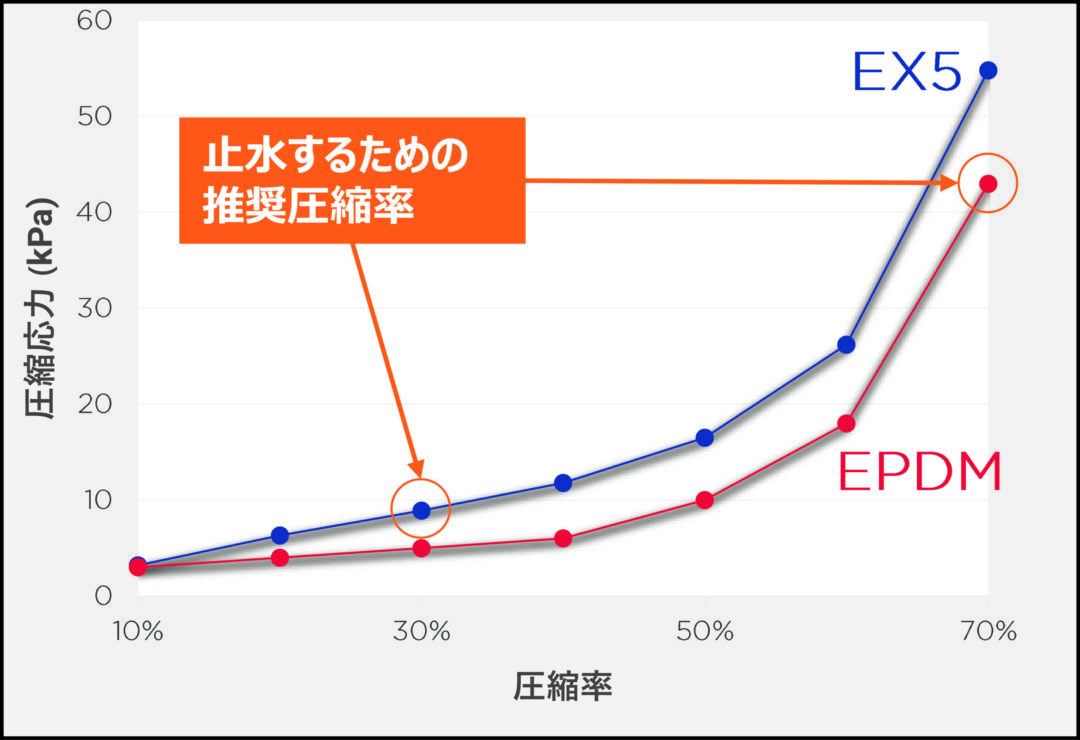 止水に必要な推奨圧縮率は、ノルシールEX5は30%、一般的なEPDMフォーム材は70%以上です。