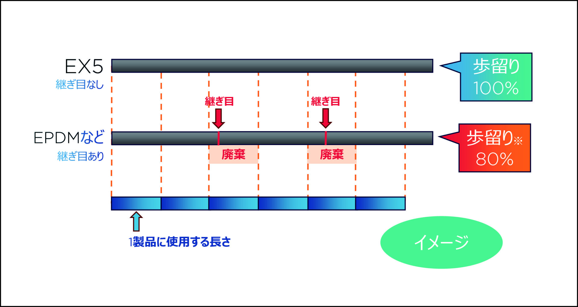 長尺のノルシールEX5は、歩留まりが非常によく、材料ロスを最大限減らすことができ、工程全体の効率を良くすることができ、継ぎ目の処理は加工コストが発生するだけでなく、止水性能にも影響を及ぼす可能性があります。長尺の材料であれば、それらを改善することが可能です。