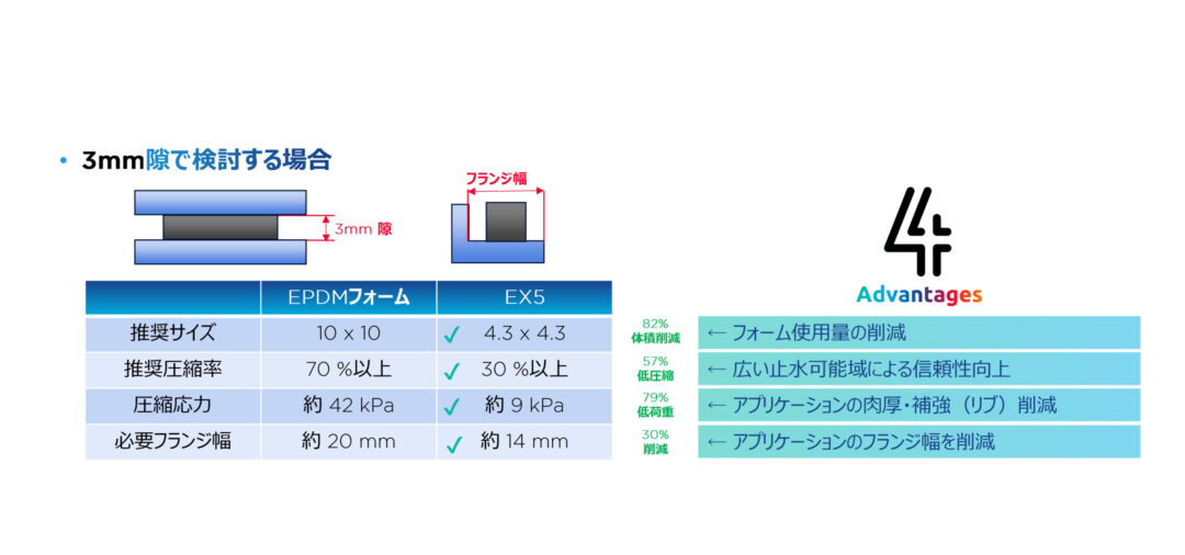 ノルシールEX5は、優れた圧縮特性と復元性により、非常に幅広い圧縮レンジで止水性能を発揮することができ、従来のEPDMフォーム材より小型化することで、コストメリットと設計の自由度を提供します。